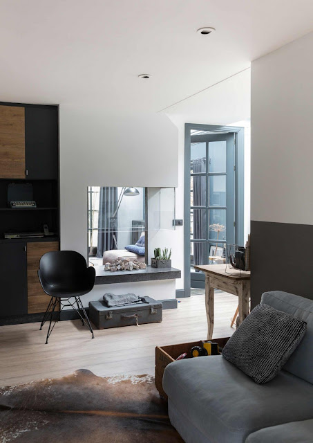 ...shades of blue and green, industrial elements, polished concrete floors and a warm and cozy atmosphere!